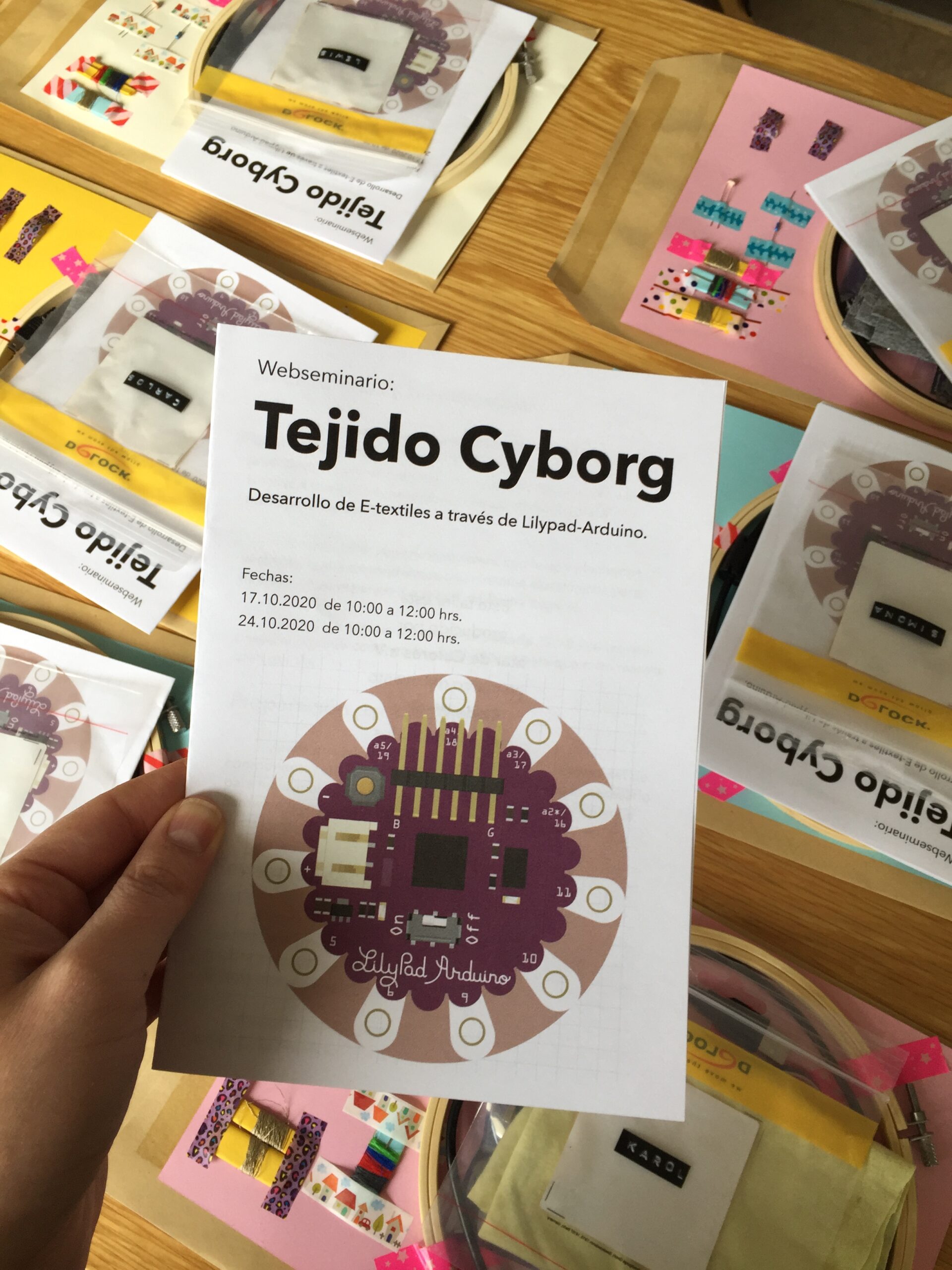 El Web-seminar Tejido Cyborg fue un workshop interactivo desarrollado por Mar de Colores e.V. en marco del Code Week EU 2020 y financiado por el Meet and Code. Este workshop brindó, de manera lúdica, una introducción a técnicas de programación y prototipado para el desarrollo de vestibles electrónicos por medio de la tecnología Lylipad-Arduino (placa microprocesadora). Fue desarrollado para chiques con historia de migración de entre 10 a 16 años en Berlín, les cuales fueron convocados durante 2 sesiones para un workshop práctico que se realizó de manera on-line. Sin embargo, les participantes previamente recibieron, por correo postal, un set de componentes electrónicos y textiles para llevar a cabo los ejercicios tanto a nivel de programación (software), como a nivel de materialidad (hardware).