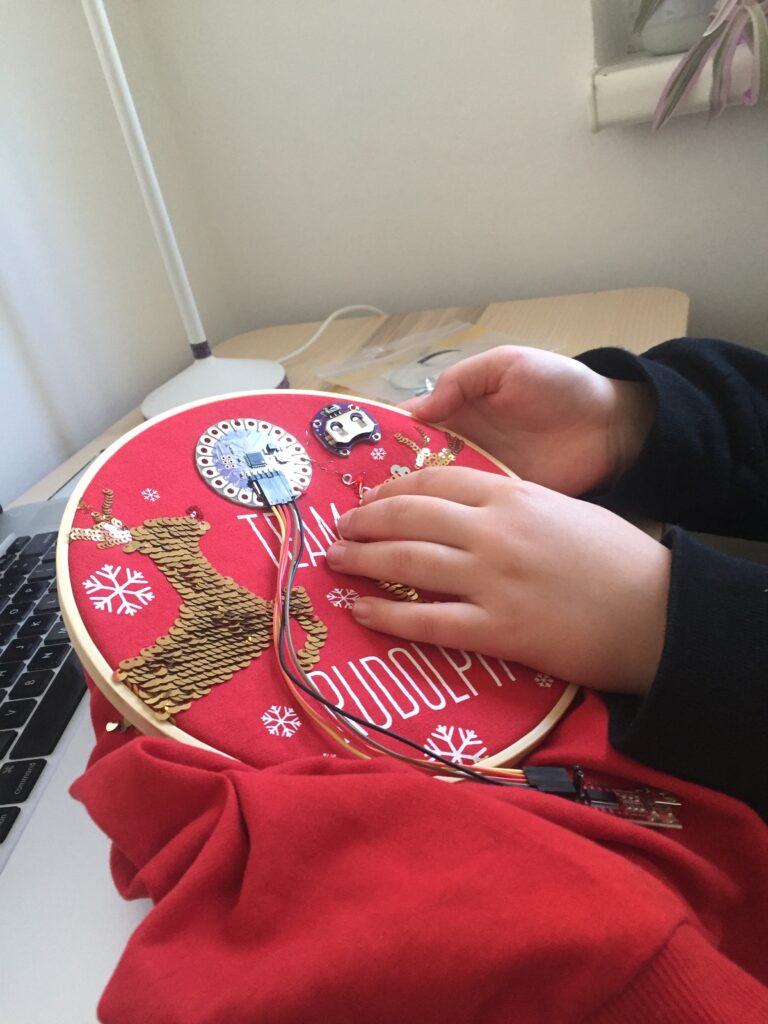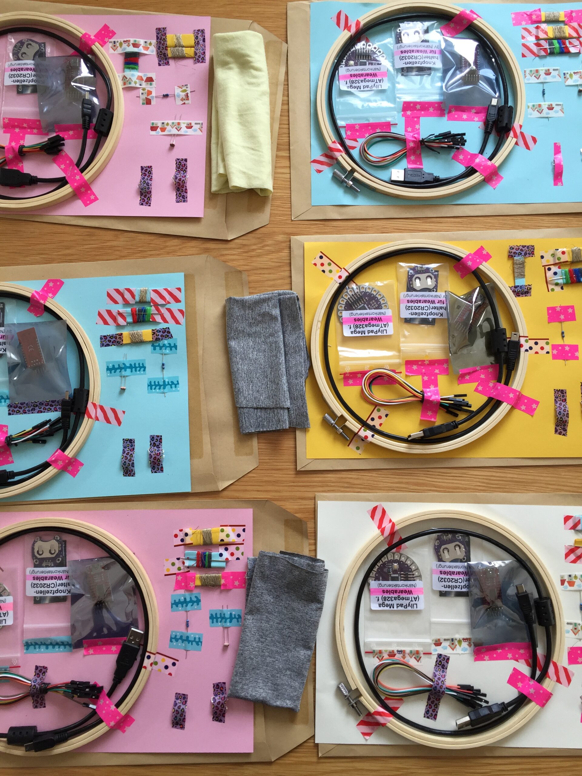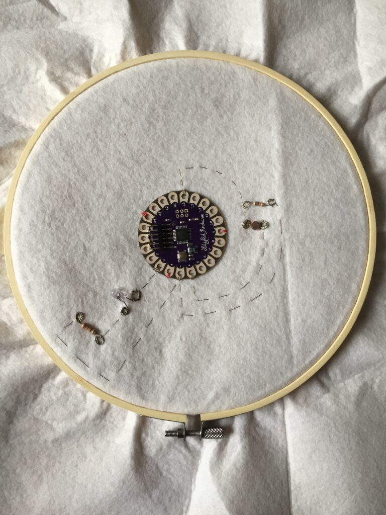 Das Cyborggewebe Web-Seminar bietet auf spielerische Weise eine Einführung in Programmier- und Prototyping-Methoden und -Techniken für die Entwicklung von elektronischer und E-Textil-Bekleidung mit Hilfe der Lylipad-Arduino-Technologie (Mikroprozessorplatine). Es wurde für Kinder mit Migrationsgeschichte im Alter von 10 bis 16 Jahren in Berlin entwickelt, die für 2 Sitzungen zu einem praktischen Workshop eingeladen wurden, der online durchgeführt wurde. Allerdings erhielten die Teilnehmer:innen zuvor per Post ein Set elektronischer Komponenten und Textilien, um die Übungen sowohl auf der Programmier- (Software) als auch auf der Materialebene (Hardware) durchführen zu können.